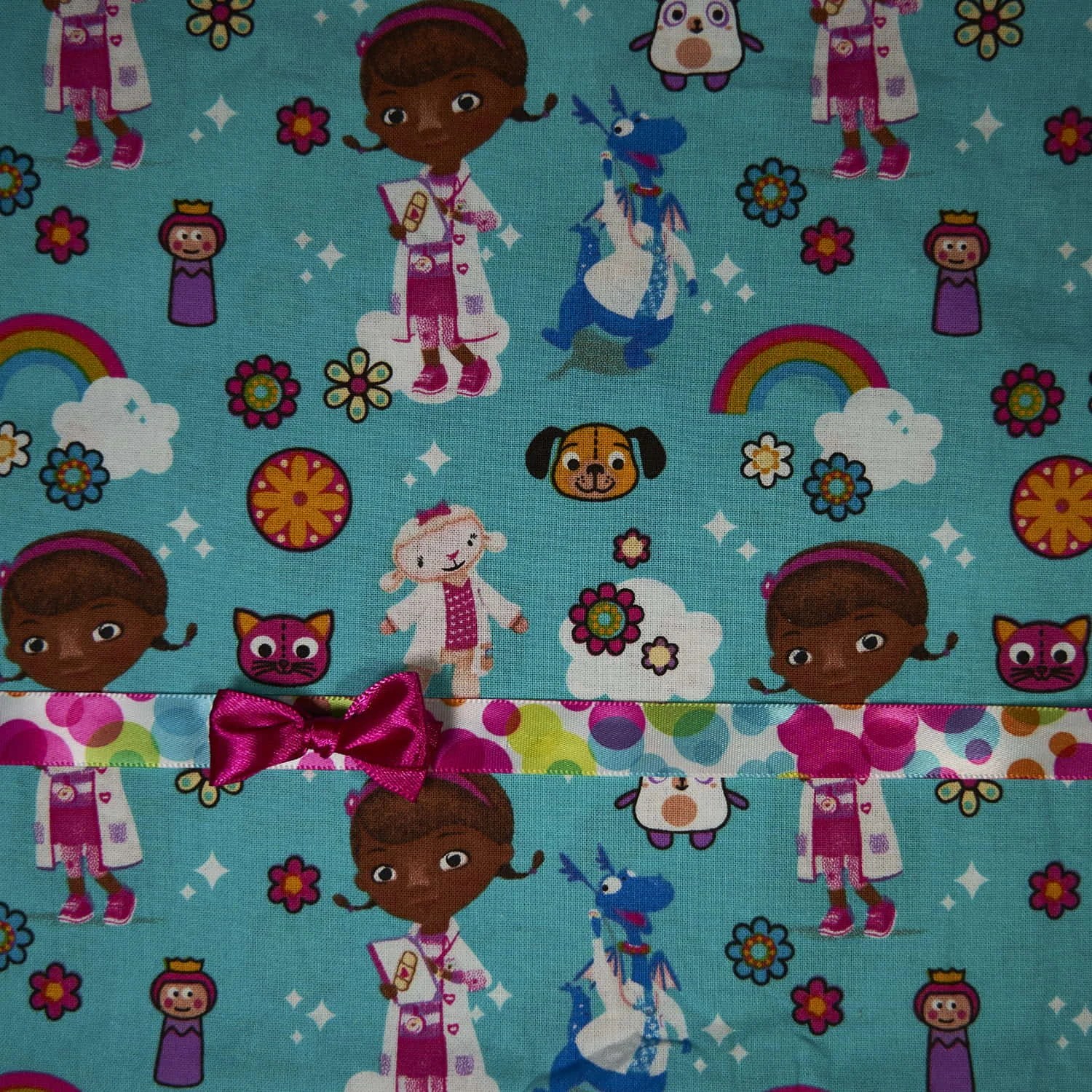 This fabric and ribbon combination features a Doc McStuffins print with complimentary colored ribbon and bow. Choose from any of our scrub cap styles.