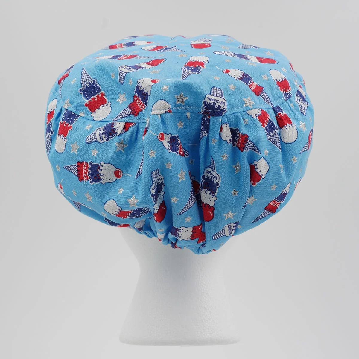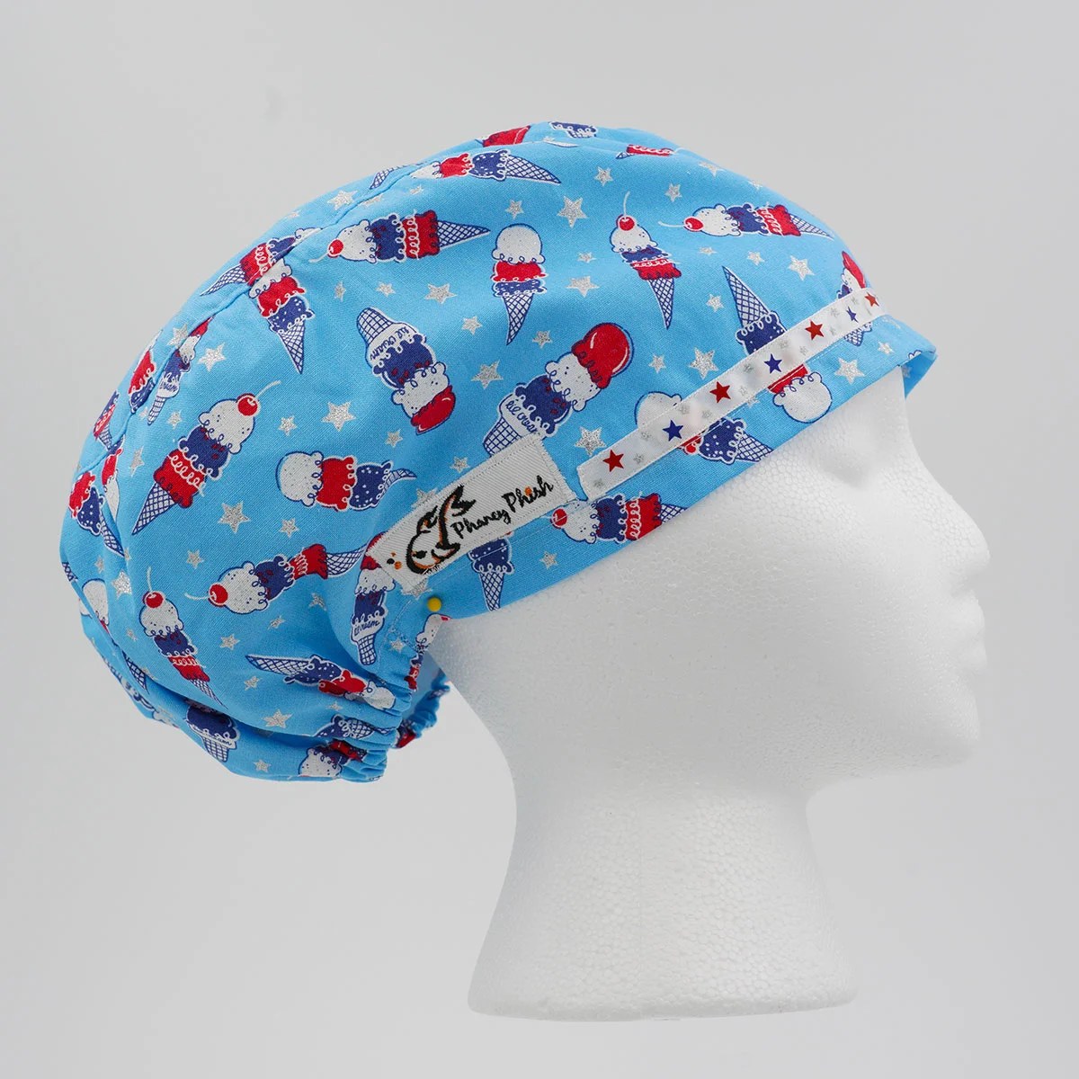 Our standard style scrub cap with red, white and blue ice cream cones print. This hat comes with an accent ribbon and bow.